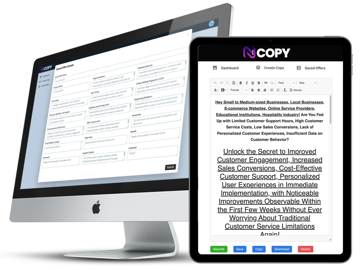 Simply enter information about your offer, and NovaCopy will automatically apply it to any of the available framework. Choose what OpenAI model to use from GPT 3.5 to the latest GPT 4 models and pre-save any offer or business info for rapid re-use.
