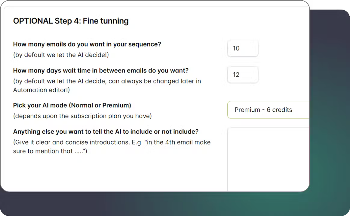 Take charge of your email campaign's structure, selecting the number of messages and their delivery timing, or opt for AI's optimized suggestions.