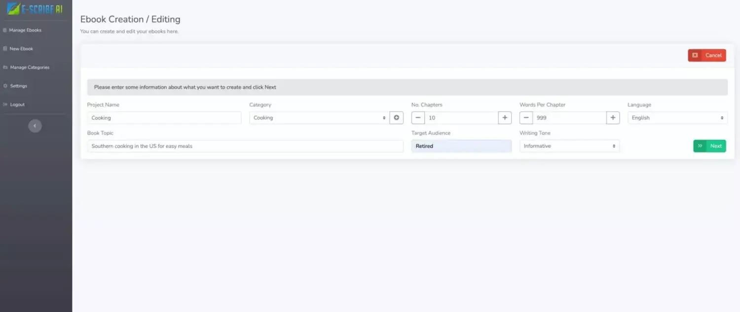 Enter your project name, choose the category or create a new one. Decide on the words per chapter and how many chapters you require. Add the topic you want to book to be about. Then choose your audience and writing tone. That's click one!