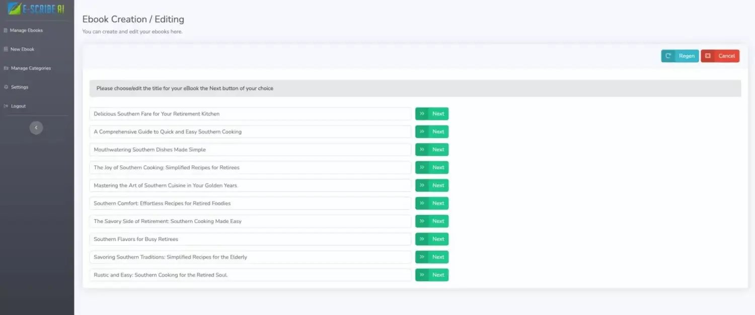 The system will generate ten ideas for book titles choose the one you want to use or click regen for another ten ideas. You can also manually edit any of the titles if you like one but just want it to be a little different. Choose the title click next... Thats click two.