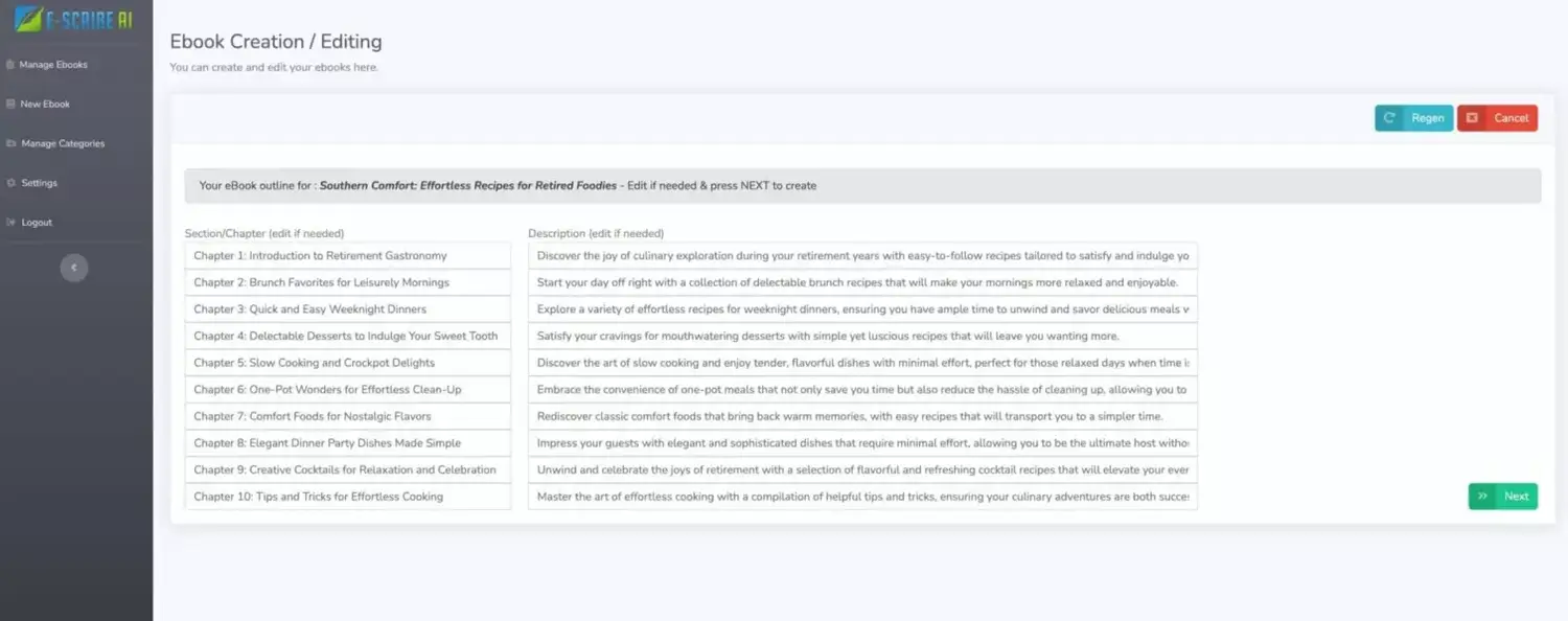 The system then outlines the book. Again you can add or edit anything you wish and also "regen" the whole outline. Then click next and the system goes off and works its magic to start building your ebook. That's click three!