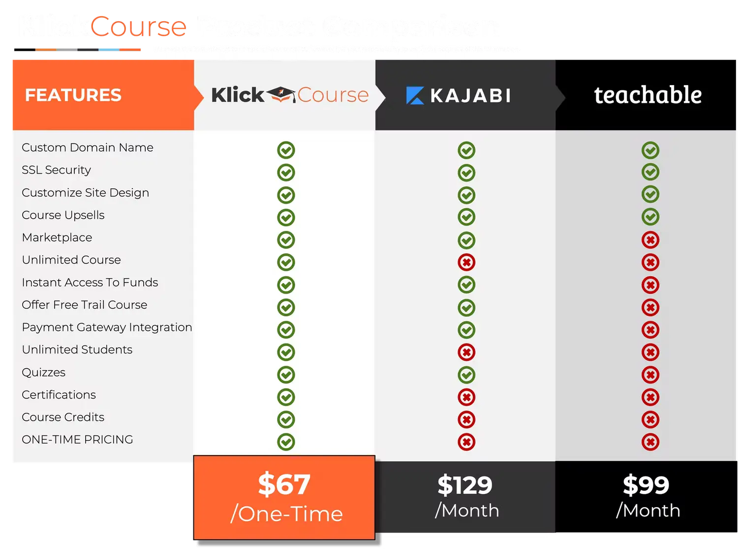 KlickCourse Comparison Table With KAJABI & TEACHABLE