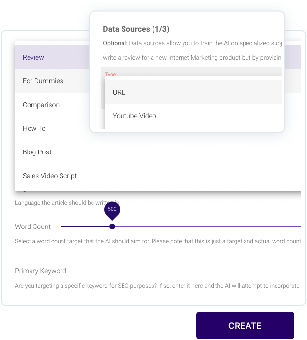 You’ll be selecting which type of review article you want (i.e a “Regular” Review article, “X vs Y, comparison” review, “for Dummies” etc), select your language, how long you want your article to be (500-1,800 words), enter your primary and secondary keywords you want our app to optimize for, your affiliate links, and the URL’s you’d like our app to write your review about and much more!