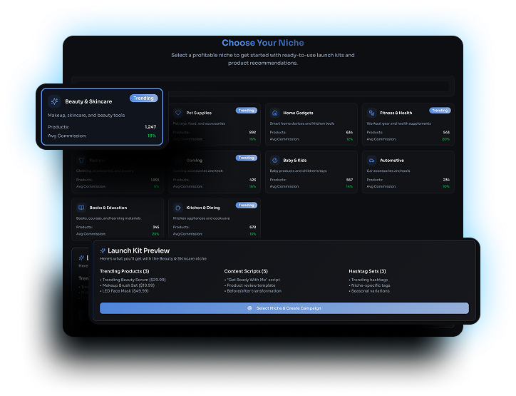 Choose from 10 pre-loaded categories (Beauty, Pets, Home Gadgets, Fitness, Tech, etc.) or enter your own. Takes 5 seconds.
