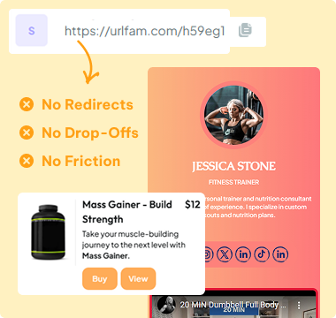 Let customers purchase directly inside your URLFAM link — no redirects, no drop-offs, no friction.