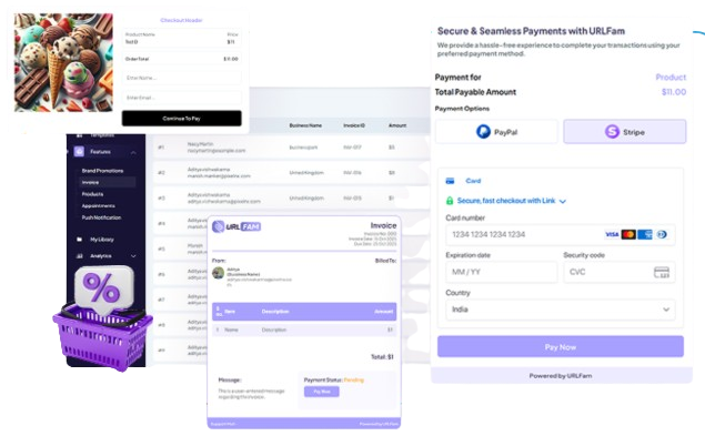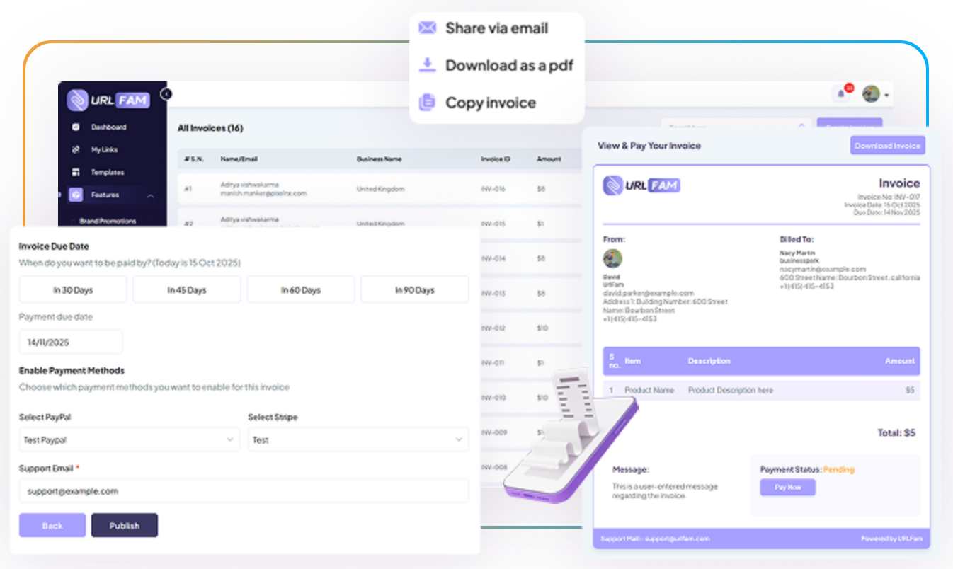 No more juggling payment tools. Create and share branded invoices as PDFs via email, track payments in real-time, and manage all transactions — right inside your URLFAM dashboard.
