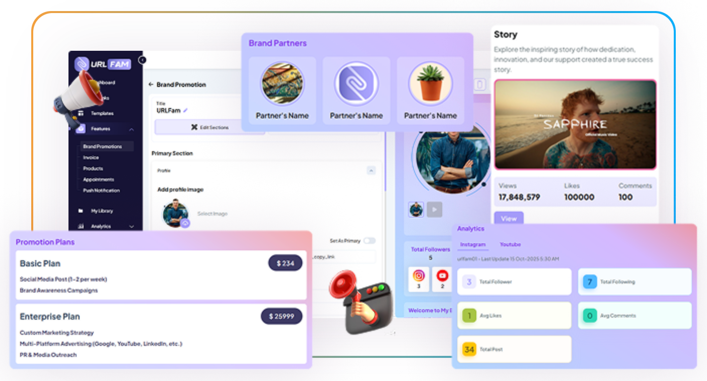 URLFAM lets you share your socials, music, videos, and content hubs in one branded page.