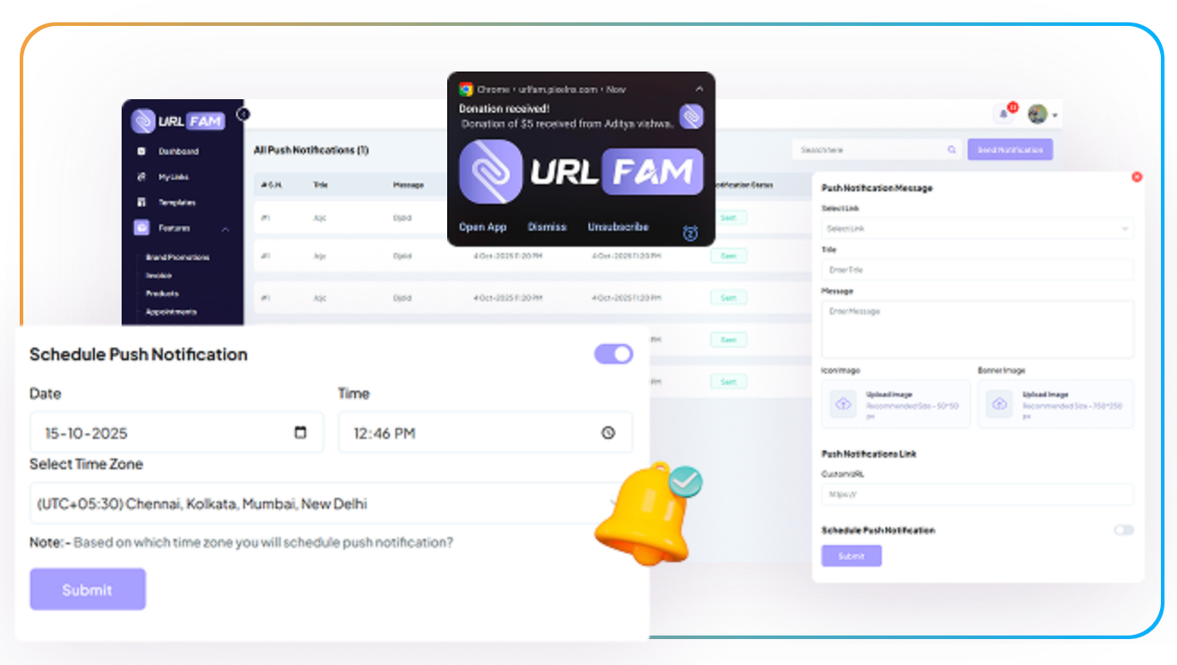 Keep your subscribers in the loop with real-time updates. Send push notifications for new offers, brand announcements, or collaborations — directly to users who’ve subscribed to your URLFAM link.
