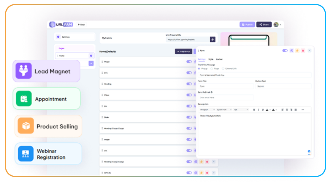 URLFAM keeps users inside one mobile-first link so leads can discover, buy, book, and opt-in without ever leaving the page — turning wasted clicks into instant conversions.