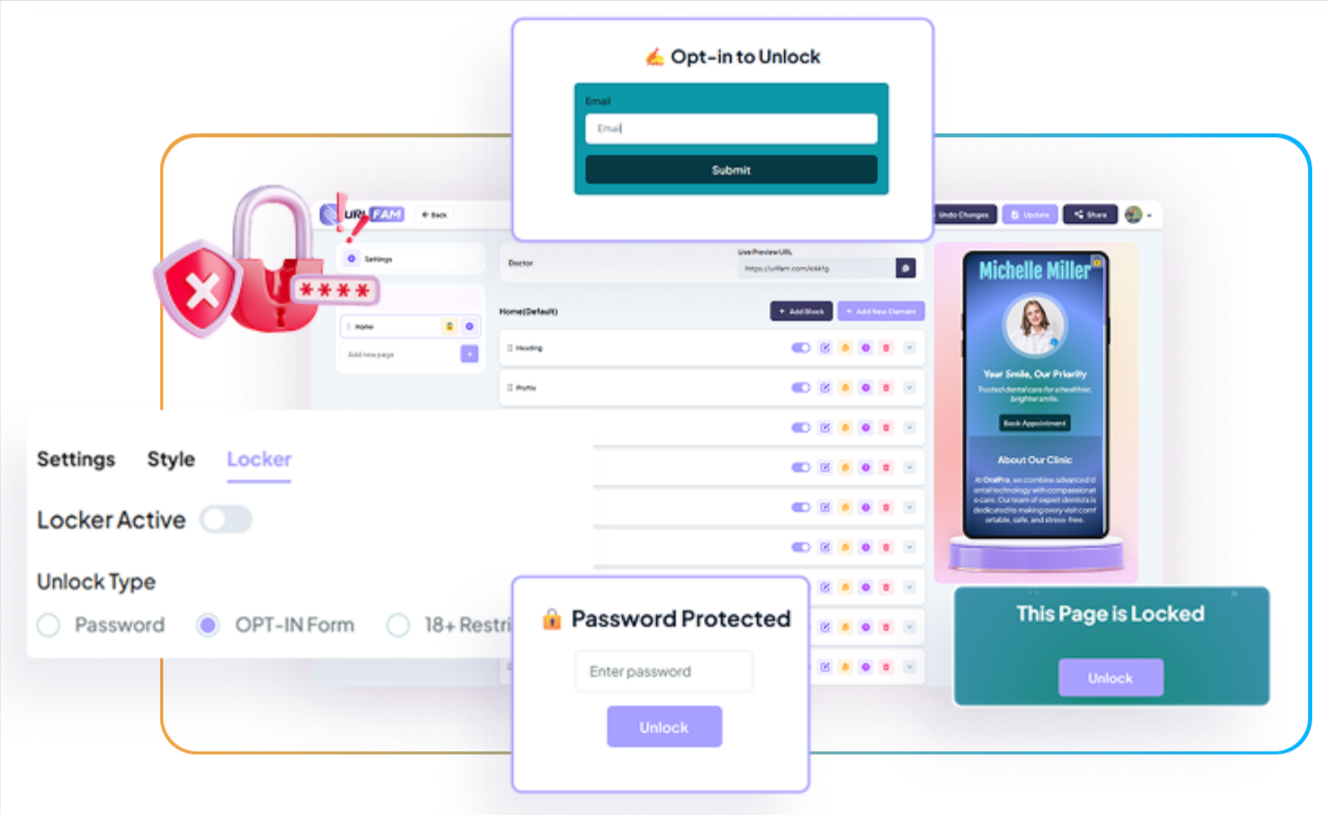 Add built-in forms, WhatsApp opt-ins, or gated content — URLFAM’s Locker™ collects leads before access, legally and effortlessly growing your list.